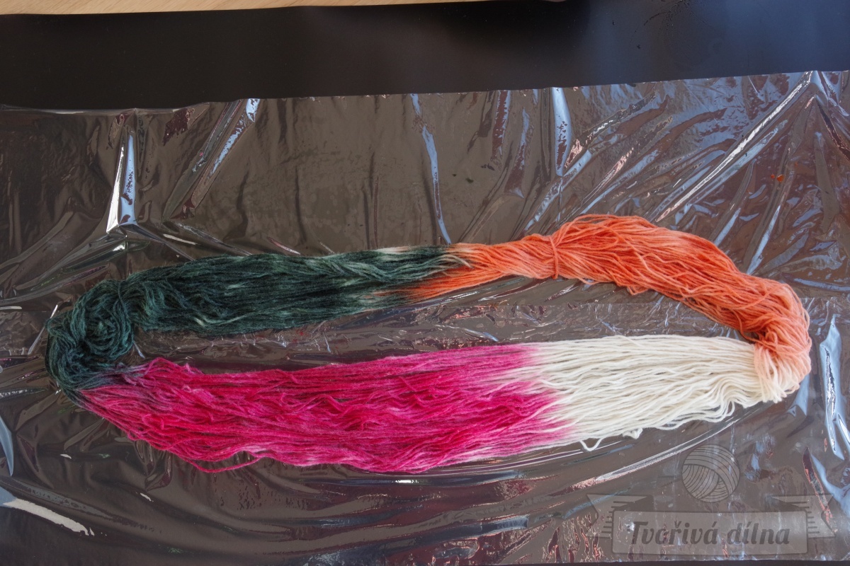 Opět se nám bude lépe pracovat s přadenem. Nachystáme si barvy tzn. naředíme dle potřeby třeba v zavařovacích sklenicích. Na pracovní desku si dáme potravinářskou folii a na ni dáme již předem namočenou přízi. Bude se tak do ní lépe vsakovat barva.